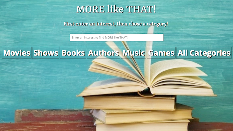 More Like That is a frontend JavaScript based application that allows a user to search for and discover new music, movies, books, and games.