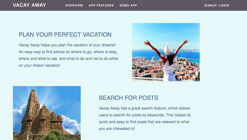Vacay Away is a fullstack JavaScript app, where users can create an account, login, and search for ideas to help them plan their perfect vacation. The app has a built in search feature, and allows users to add posts to their favorites for convenience.